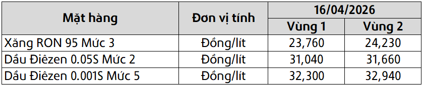 Mức giá mới có hiệu lực từ thời điểm 00 giờ 00 phút ngày 16 tháng 04 năm 2026 cho đến kỳ điều hành giá xăng dầu tiếp theo của liên Bộ Công Thương – Tài Chính, được công khai tại website hpetro.vn.