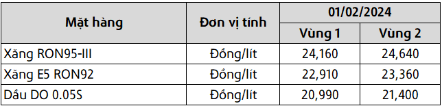 Mức giá mới có hiệu lực từ thời điểm 15 giờ 00 phút ngày 01 tháng 02 năm 2024 cho đến kỳ điều hành giá xăng dầu tiếp theo của liên Bộ Công Thương – Tài Chính, được công khai tại website hpetro.vn.
