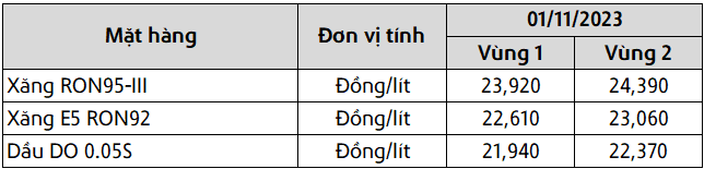 Mức giá mới có hiệu lực từ thời điểm 15 giờ 00 phút ngày 01 tháng 11 năm 2023 cho đến kỳ điều hành giá xăng dầu tiếp theo của liên Bộ Công Thương – Tài Chính, được công khai tại website hpetro.vn.