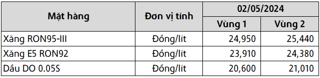 Mức giá mới có hiệu lực từ thời điểm 15 giờ 00 phút ngày 02 tháng 05 năm 2024 cho đến kỳ điều hành giá xăng dầu tiếp theo của liên Bộ Công Thương – Tài Chính, được công khai tại website hpetro.vn.