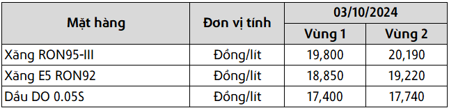 Mức giá mới có hiệu lực từ thời điểm 15 giờ 00 phút ngày 03 tháng 10 năm 2024 cho đến kỳ điều hành giá xăng dầu tiếp theo của liên Bộ Công Thương – Tài Chính, được công khai tại website hpetro.vn.