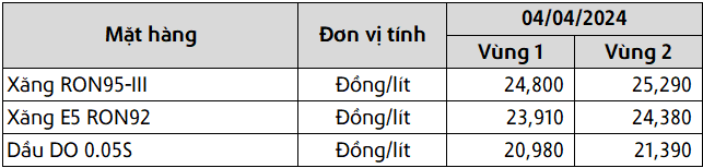 Mức giá mới có hiệu lực từ thời điểm 15 giờ 00 phút ngày 04 tháng 04 năm 2024 cho đến kỳ điều hành giá xăng dầu tiếp theo của liên Bộ Công Thương – Tài Chính, được công khai tại website hpetro.vn.