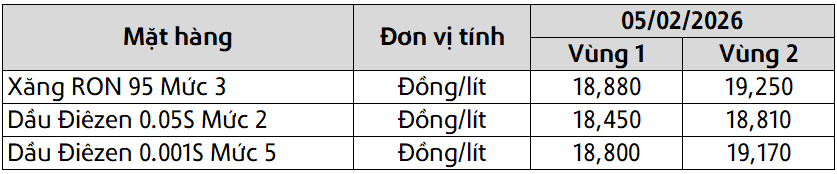 Mức giá mới có hiệu lực từ thời điểm 15 giờ 00 phút ngày 05 tháng 02 năm 2026 cho đến kỳ điều hành giá xăng dầu tiếp theo của liên Bộ Công Thương – Tài Chính, được công khai tại website hpetro.vn.