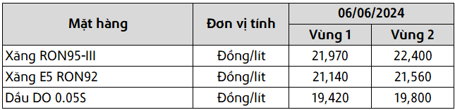 Mức giá mới có hiệu lực từ thời điểm 15 giờ 00 phút ngày 06 tháng 06 năm 2024 cho đến kỳ điều hành giá xăng dầu tiếp theo của liên Bộ Công Thương – Tài Chính, được công khai tại website hpetro.vn.
