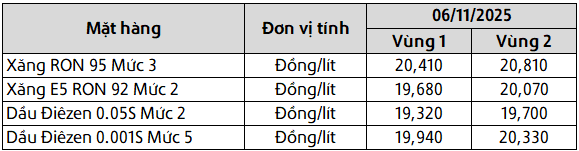 Mức giá mới có hiệu lực từ thời điểm 15 giờ 00 phút ngày 06 tháng 11 năm 2025 cho đến kỳ điều hành giá xăng dầu tiếp theo của liên Bộ Công Thương – Tài Chính, được công khai tại website hpetro.vn.