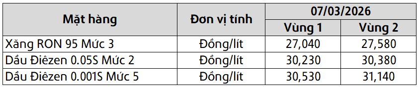 Mức giá mới có hiệu lực từ thời điểm 15 giờ 00 phút ngày 07 tháng 03 năm 2026 cho đến kỳ điều hành giá xăng dầu tiếp theo của liên Bộ Công Thương – Tài Chính, được công khai tại website hpetro.vn.