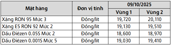 Mức giá mới có hiệu lực từ thời điểm 15 giờ 00 phút ngày 09 tháng 10 năm 2025 cho đến kỳ điều hành giá xăng dầu tiếp theo của liên Bộ Công Thương – Tài Chính, được công khai tại website hpetro.vn.