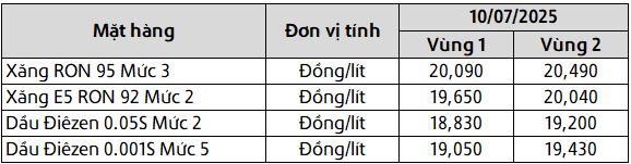 Mức giá mới có hiệu lực từ thời điểm 15 giờ 00 phút ngày 10 tháng 07 năm 2025 cho đến kỳ điều hành giá xăng dầu tiếp theo của liên Bộ Công Thương – Tài Chính, được công khai tại website hpetro.vn.