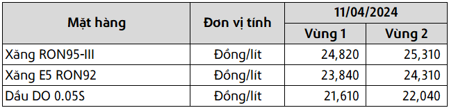Mức giá mới có hiệu lực từ thời điểm 15 giờ 00 phút ngày 11 tháng 04 năm 2024 cho đến kỳ điều hành giá xăng dầu tiếp theo của liên Bộ Công Thương – Tài Chính, được công khai tại website hpetro.vn.