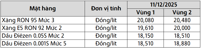Mức giá mới có hiệu lực từ thời điểm 15 giờ 00 phút ngày 11 tháng 12 năm 2025 cho đến kỳ điều hành giá xăng dầu tiếp theo của liên Bộ Công Thương – Tài Chính, được công khai tại website hpetro.vn.
