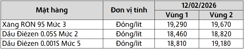 Mức giá mới có hiệu lực từ thời điểm 15 giờ 00 phút ngày 12 tháng 02 năm 2026 cho đến kỳ điều hành giá xăng dầu tiếp theo của liên Bộ Công Thương – Tài Chính, được công khai tại website hpetro.vn.
