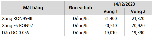 Mức giá mới có hiệu lực từ thời điểm 15 giờ 00 phút ngày 14 tháng 12 năm 2023 cho đến kỳ điều hành giá xăng dầu tiếp theo của liên Bộ Công Thương – Tài Chính, được công khai tại website hpetro.vn.