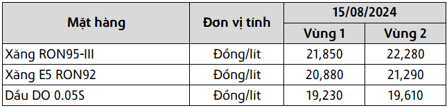 Mức giá mới có hiệu lực từ thời điểm 15 giờ 00 phút ngày 15 tháng 08 năm 2024 cho đến kỳ điều hành giá xăng dầu tiếp theo của liên Bộ Công Thương – Tài Chính, được công khai tại website hpetro.vn.