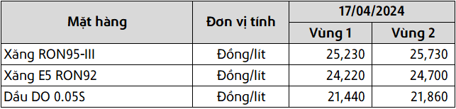 Mức giá mới có hiệu lực từ thời điểm 15 giờ 00 phút ngày 17 tháng 04 năm 2024 cho đến kỳ điều hành giá xăng dầu tiếp theo của liên Bộ Công Thương – Tài Chính, được công khai tại website hpetro.vn.