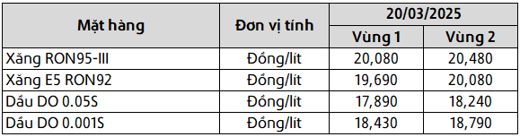 Mức giá mới có hiệu lực từ thời điểm 15 giờ 00 phút ngày 20 tháng 03 năm 2025 cho đến kỳ điều hành giá xăng dầu tiếp theo của liên Bộ Công Thương – Tài Chính, được công khai tại website hpetro.vn.