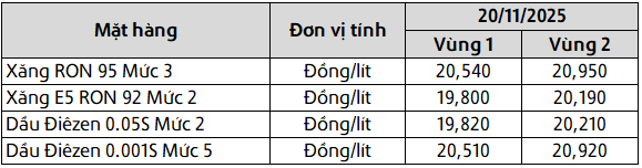 Mức giá mới có hiệu lực từ thời điểm 15 giờ 00 phút ngày 20 tháng 11 năm 2025 cho đến kỳ điều hành giá xăng dầu tiếp theo của liên Bộ Công Thương – Tài Chính, được công khai tại website hpetro.vn.