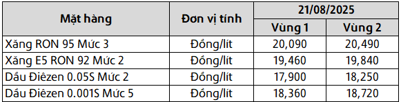 Mức giá mới có hiệu lực từ thời điểm 15 giờ 00 phút ngày 21 tháng 08 năm 2025 cho đến kỳ điều hành giá xăng dầu tiếp theo của liên Bộ Công Thương – Tài Chính, được công khai tại website hpetro.vn.