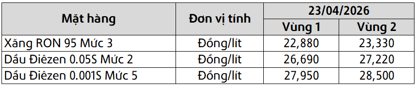 Mức giá mới có hiệu lực từ thời điểm 15 giờ 00 phút ngày 23 tháng 04 năm 2026 cho đến kỳ điều hành giá xăng dầu tiếp theo của liên Bộ Công Thương – Tài Chính, được công khai tại website hpetro.vn.