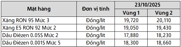 Mức giá mới có hiệu lực từ thời điểm 15 giờ 00 phút ngày 23 tháng 10 năm 2025 cho đến kỳ điều hành giá xăng dầu tiếp theo của liên Bộ Công Thương – Tài Chính, được công khai tại website hpetro.vn.