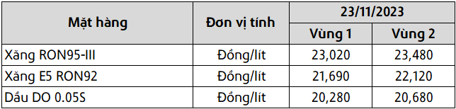 Mức giá mới có hiệu lực từ thời điểm 15 giờ 00 phút ngày 23 tháng 11 năm 2023 cho đến kỳ điều hành giá xăng dầu tiếp theo của liên Bộ Công Thương – Tài Chính, được công khai tại website hpetro.vn.