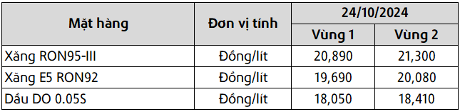 Mức giá mới có hiệu lực từ thời điểm 15 giờ 00 phút ngày 24 tháng 10 năm 2024 cho đến kỳ điều hành giá xăng dầu tiếp theo của liên Bộ Công Thương – Tài Chính, được công khai tại website hpetro.vn.