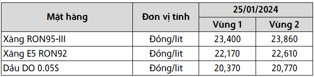 Mức giá mới có hiệu lực từ thời điểm 15 giờ 00 phút ngày 25 tháng 01 năm 2024 cho đến kỳ điều hành giá xăng dầu tiếp theo của liên Bộ Công Thương – Tài Chính, được công khai tại website hpetro.vn.