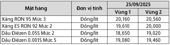 Mức giá mới có hiệu lực từ thời điểm 15 giờ 00 phút ngày 25 tháng 09 năm 2025 cho đến kỳ điều hành giá xăng dầu tiếp theo của liên Bộ Công Thương – Tài Chính, được công khai tại website hpetro.vn.