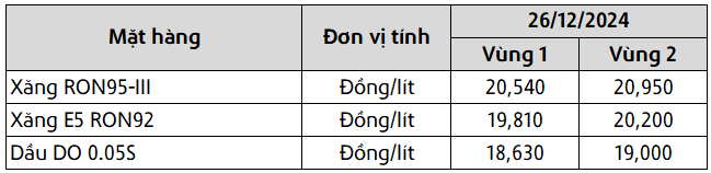 Mức giá mới có hiệu lực từ thời điểm 15 giờ 00 phút ngày 26 tháng 12 năm 2024 cho đến kỳ điều hành giá xăng dầu tiếp theo của liên Bộ Công Thương – Tài Chính, được công khai tại website hpetro.vn.