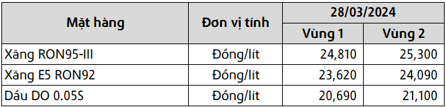 Mức giá mới có hiệu lực từ thời điểm 15 giờ 00 phút ngày 28 tháng 03 năm 2024 cho đến kỳ điều hành giá xăng dầu tiếp theo của liên Bộ Công Thương – Tài Chính, được công khai tại website hpetro.vn.