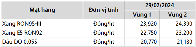 Mức giá mới có hiệu lực từ thời điểm 15 giờ 00 phút ngày 29 tháng 02 năm 2024 cho đến kỳ điều hành giá xăng dầu tiếp theo của liên Bộ Công Thương – Tài Chính, được công khai tại website hpetro.vn.