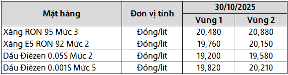 Mức giá mới có hiệu lực từ thời điểm 15 giờ 00 phút ngày 30 tháng 10 năm 2025 cho đến kỳ điều hành giá xăng dầu tiếp theo của liên Bộ Công Thương – Tài Chính, được công khai tại website hpetro.vn.