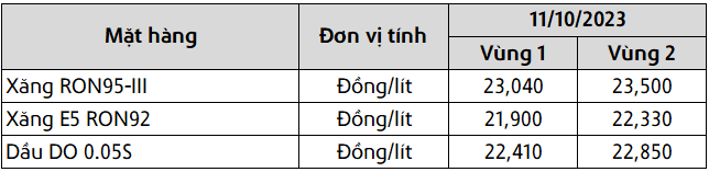 Mức giá mới có hiệu lực từ thời điểm 16 giờ 00 phút ngày 11 tháng 10 năm 2023 cho đến kỳ điều hành giá xăng dầu tiếp theo của liên Bộ Công Thương – Tài Chính, được công khai tại website hpetro.vn.