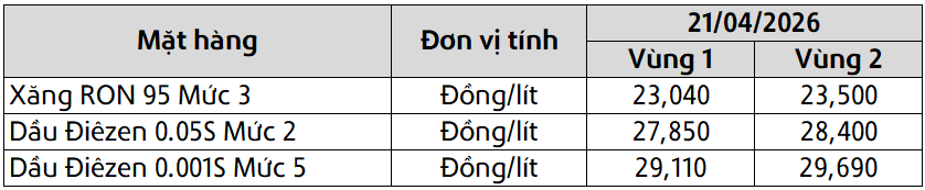 Mức giá mới có hiệu lực từ thời điểm 16 giờ 00 phút ngày 21 tháng 04 năm 2026 cho đến kỳ điều hành giá xăng dầu tiếp theo của liên Bộ Công Thương – Tài Chính, được công khai tại website hpetro.vn.