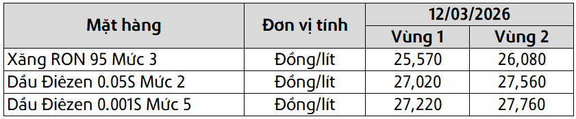 Mức giá mới có hiệu lực từ thời điểm 22 giờ 00 phút ngày 12 tháng 03 năm 2026 cho đến kỳ điều hành giá xăng dầu tiếp theo của liên Bộ Công Thương – Tài Chính, được công khai tại website hpetro.vn.