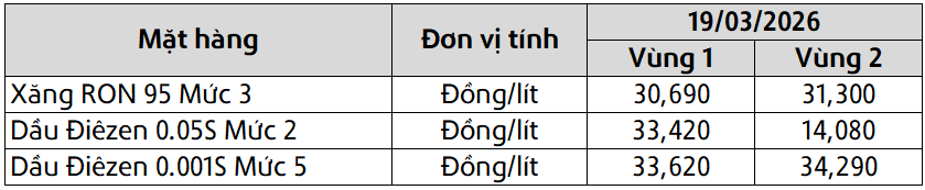 Mức giá mới có hiệu lực từ thời điểm 23 giờ 00 phút ngày 19 tháng 03 năm 2026 cho đến kỳ điều hành giá xăng dầu tiếp theo của liên Bộ Công Thương – Tài Chính, được công khai tại website hpetro.vn.