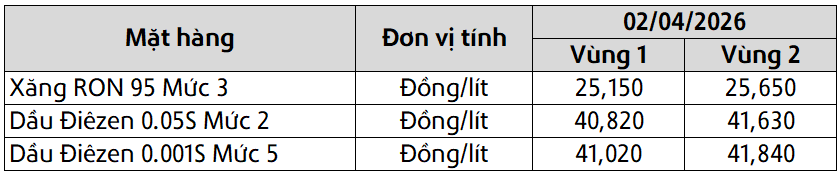 Mức giá mới có hiệu lực từ thời điểm 23 giờ 30 phút ngày 02 tháng 04 năm 2026 cho đến kỳ điều hành giá xăng dầu tiếp theo của liên Bộ Công Thương – Tài Chính, được công khai tại website hpetro.vn.